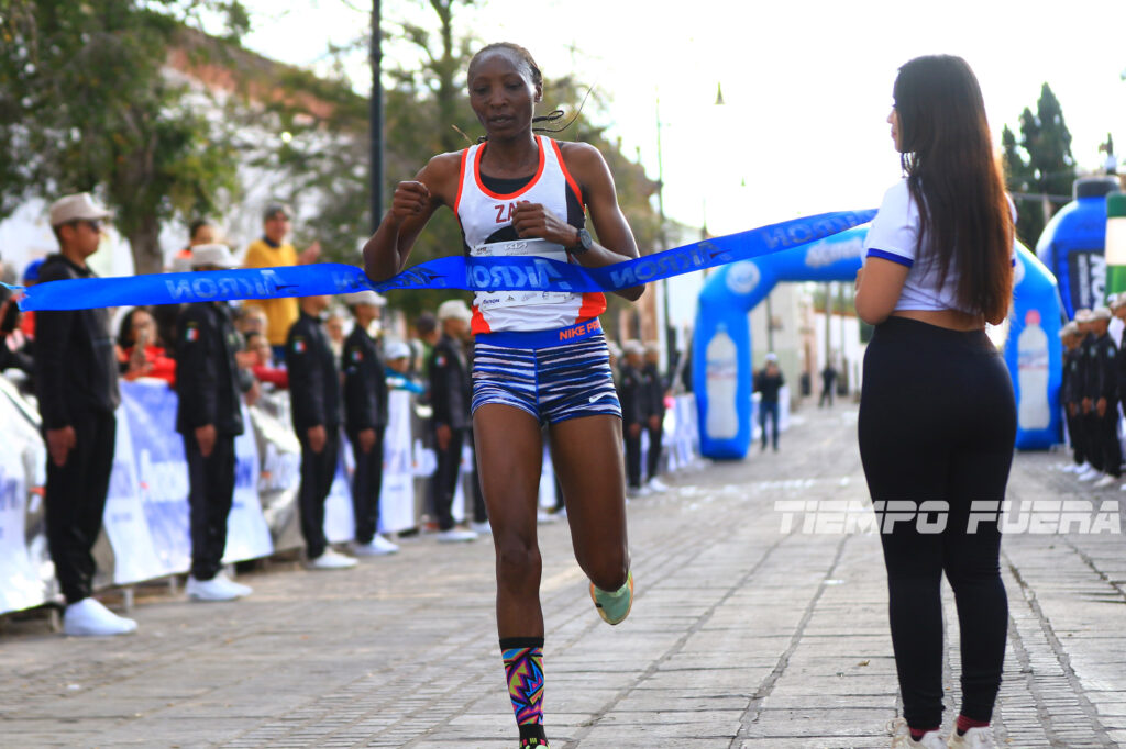 La primera mujer en concluir el desafío de los 10 kilómetros fue la keniana naturalizada mexicana Rsiper Biyaki, con un tiempo de 34’18”, la segunda plaza la ocupó Gesabwa Kemunto con 35’06” y completó el pódium María Ruiz al parar los cronos en 35’34”.
